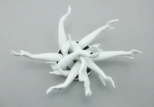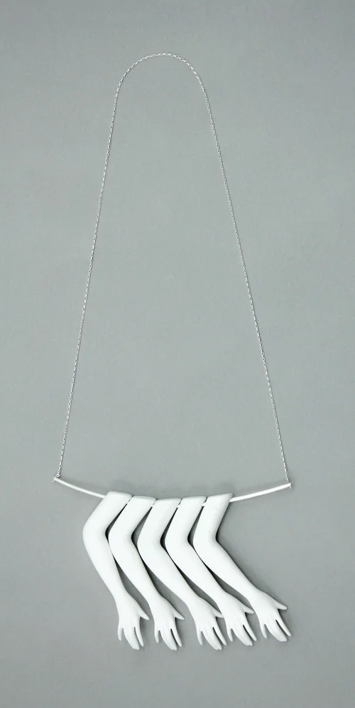 Originating with antique ceramic miniatures, I have cast and transformed four variations of arm gestures into wearable jewelry. The articulations of these symbolic bodily forms create a surreal arena for commentary on our innate need for human communication.